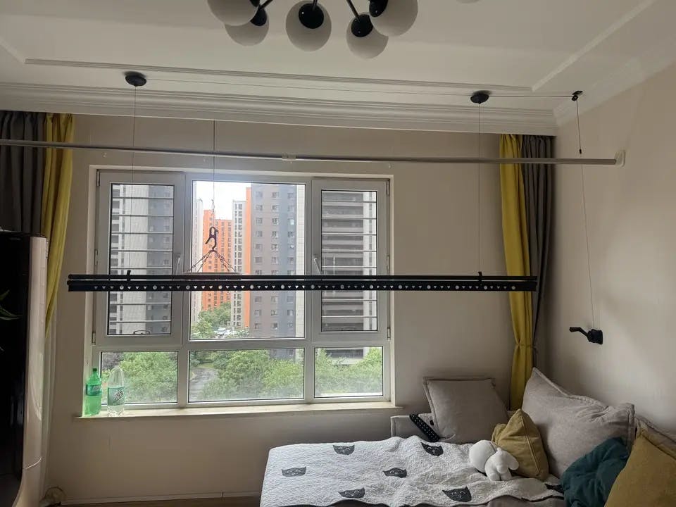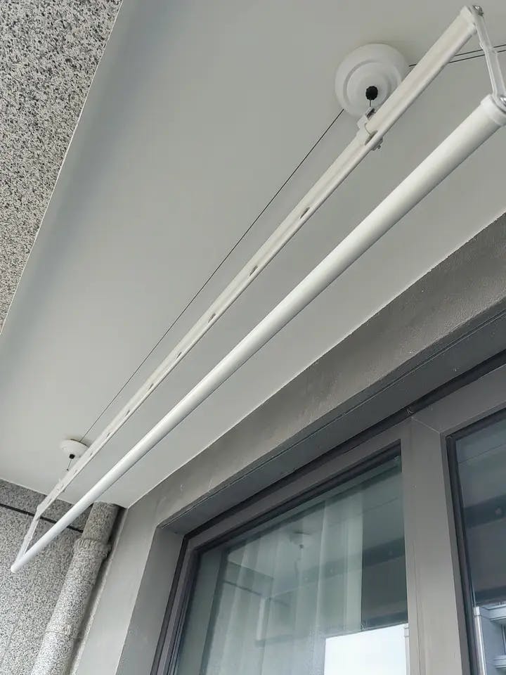 - SLIM SINGLE-ROD, SPACE-SAVING CEILING DESIGN — A clean, minimal ceiling-mounted rack that keeps floors clear—great for balcony sides, bay windows, bedrooms, and narrow curtain gaps.