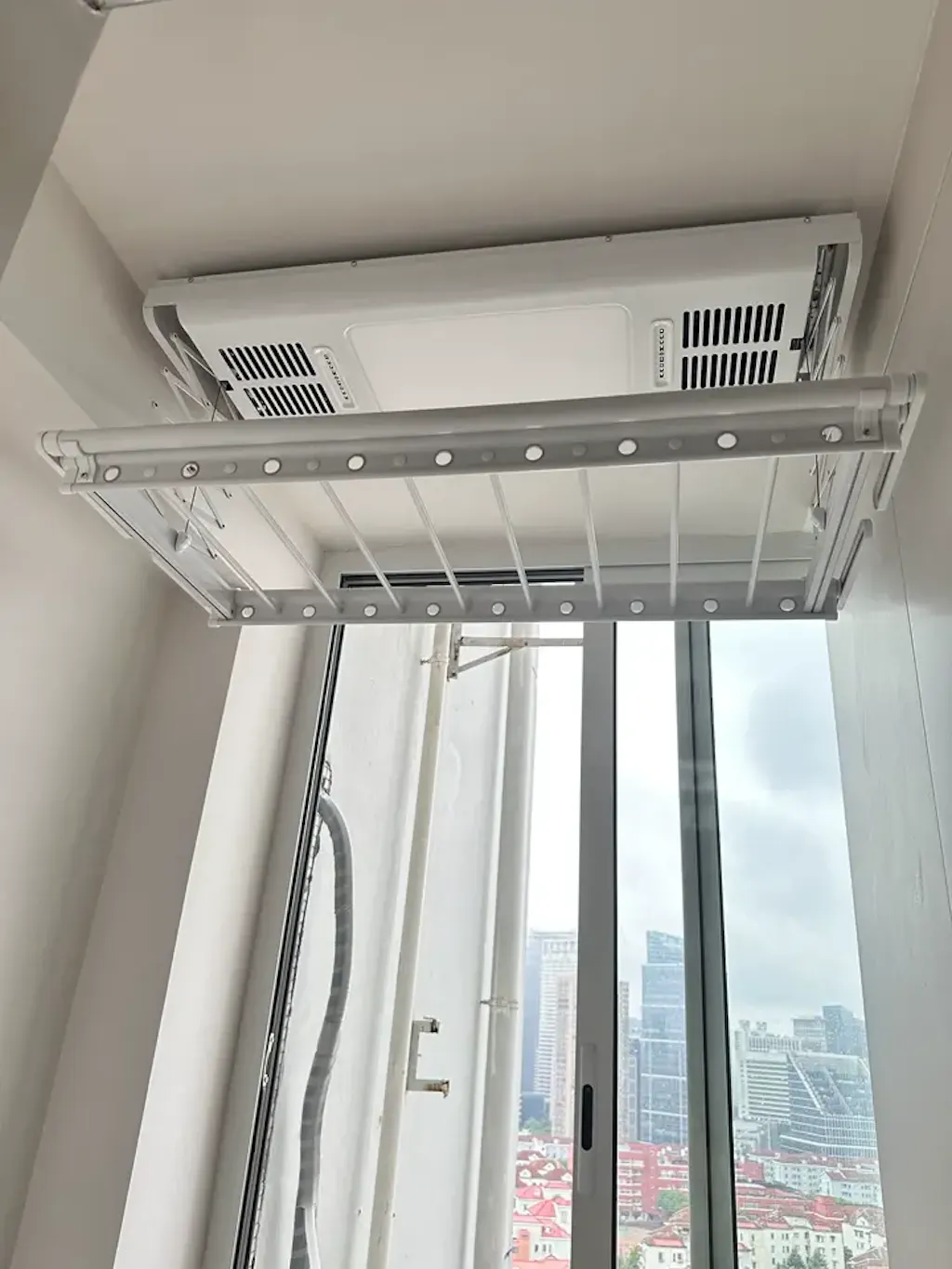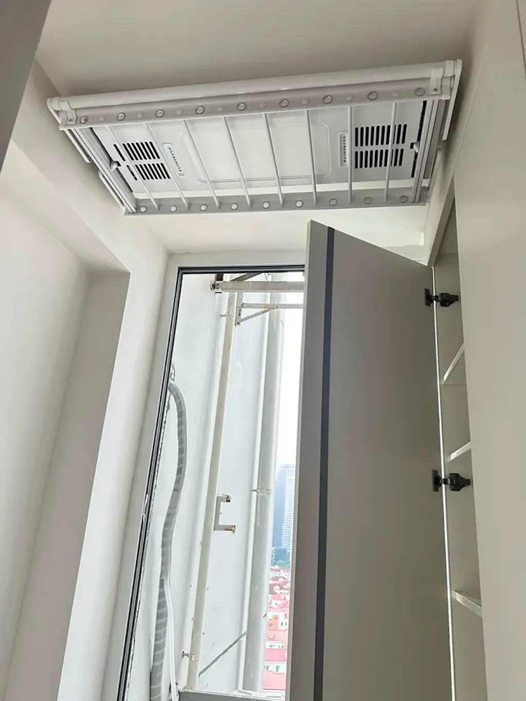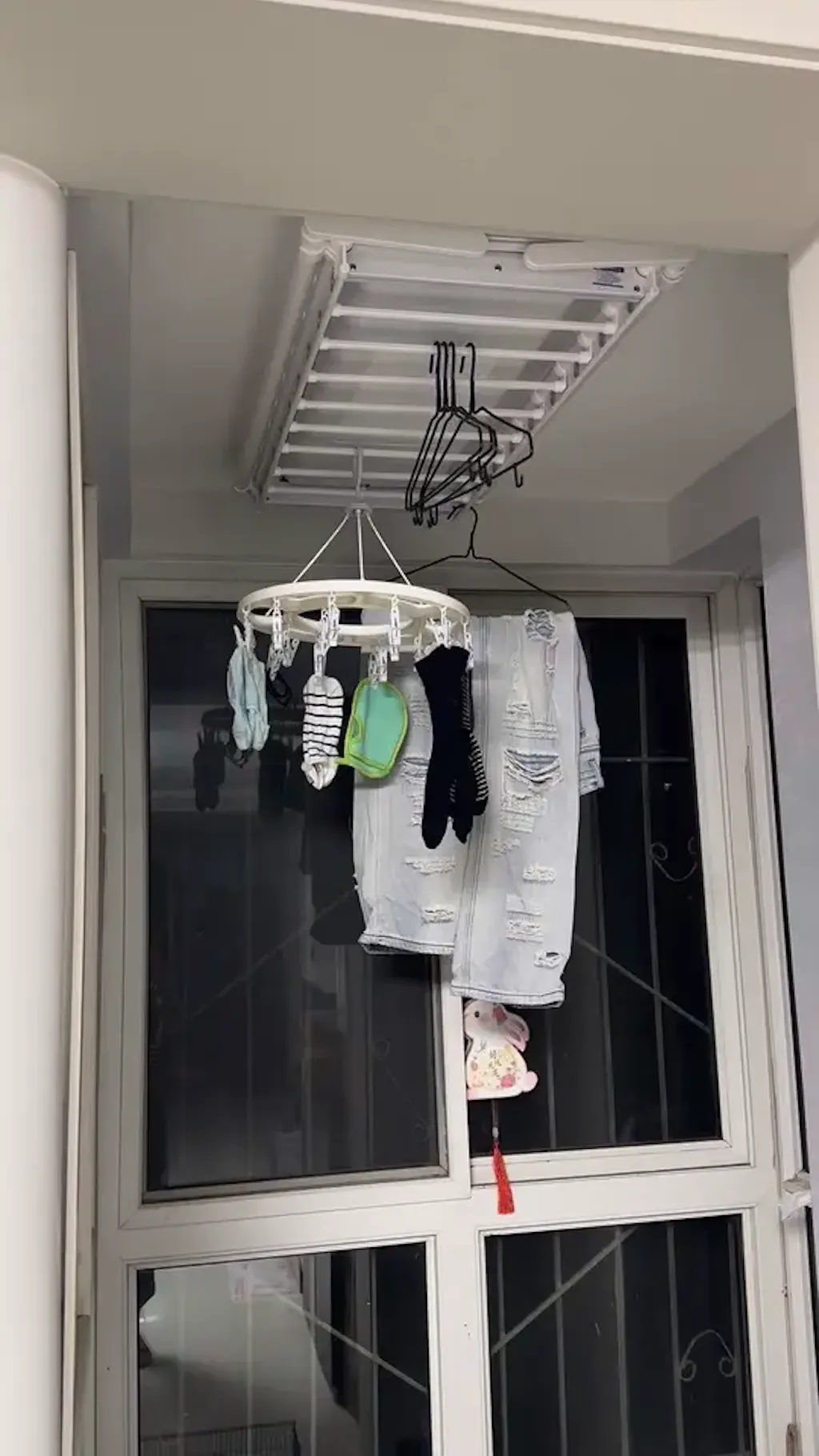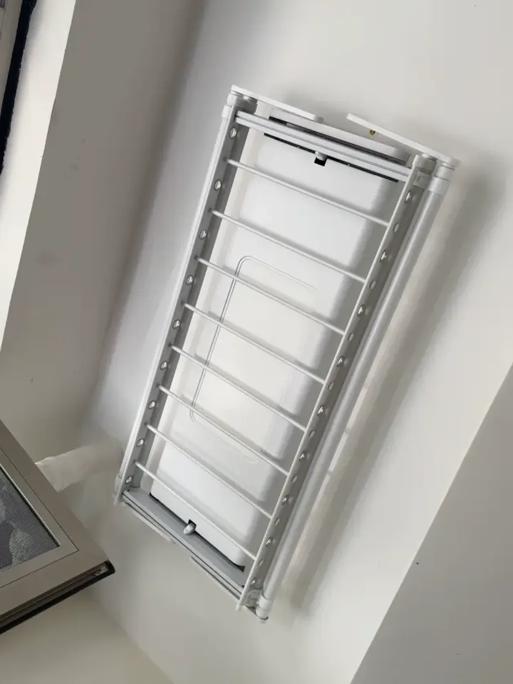 Estante EaseRack Pro instalado cerca del ventanal del dormitorio, solución de secado compacta para espacios limitados.