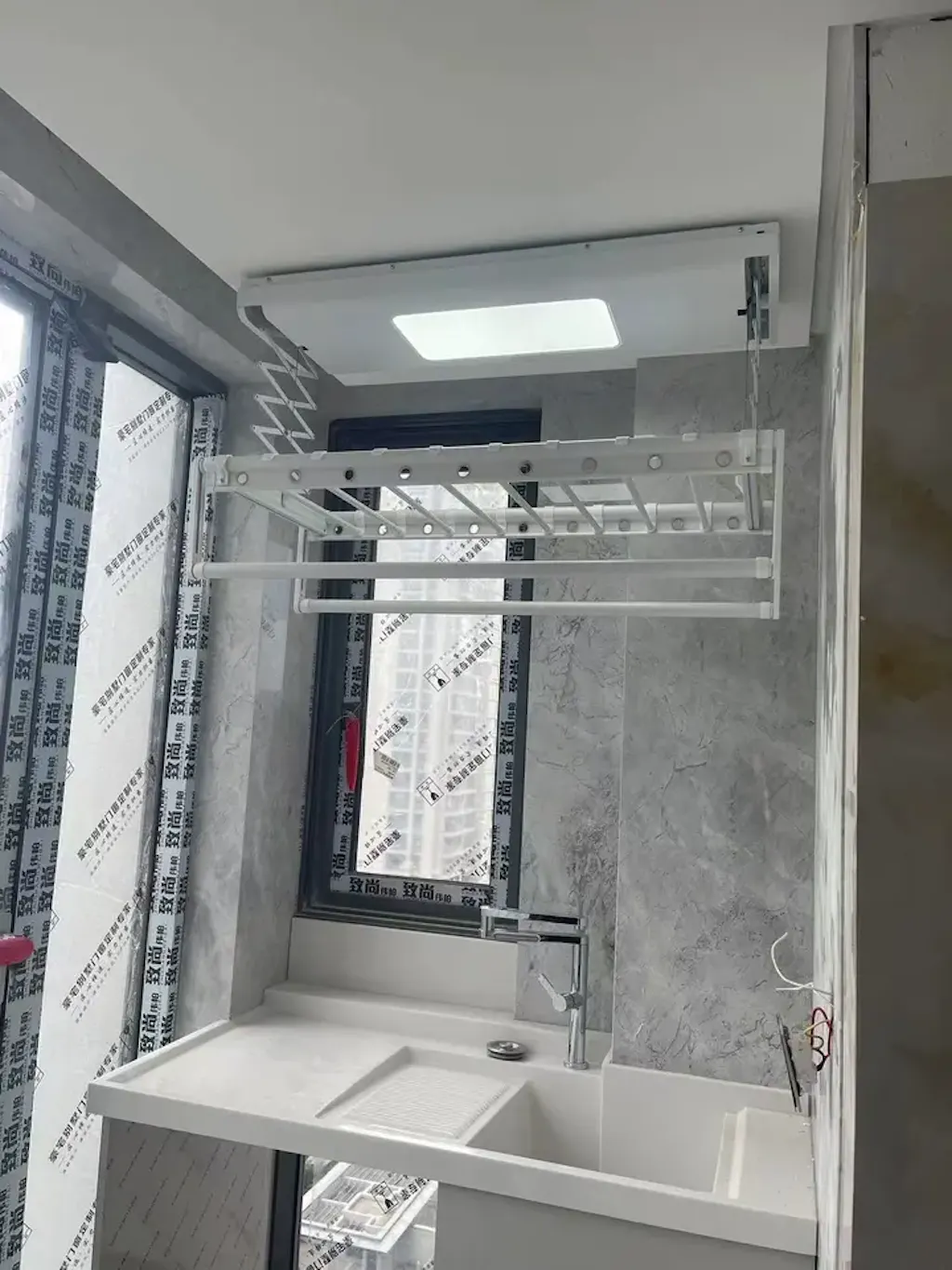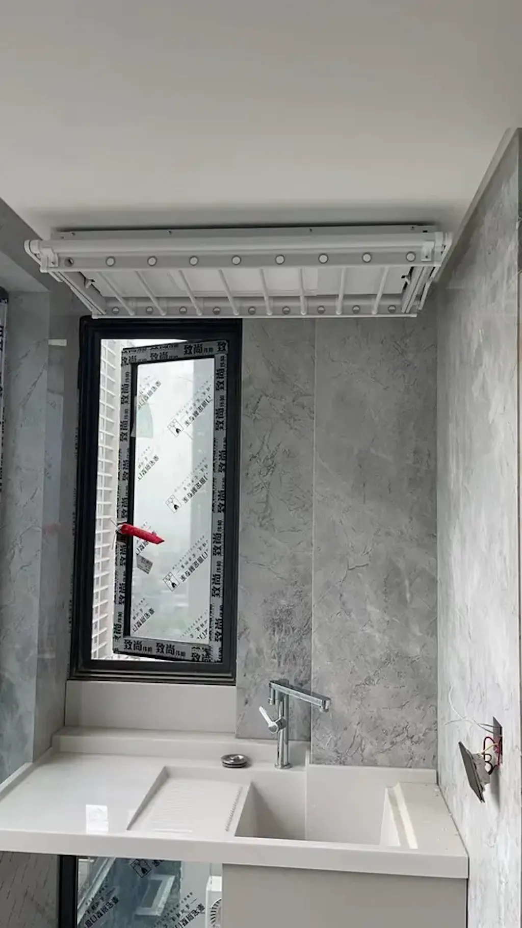 Mujer lavando ropa en una casa moderna y luminosa con un tendedero EaseRack montado en el techo, que combina elegancia, luz solar y una vida sin esfuerzo.