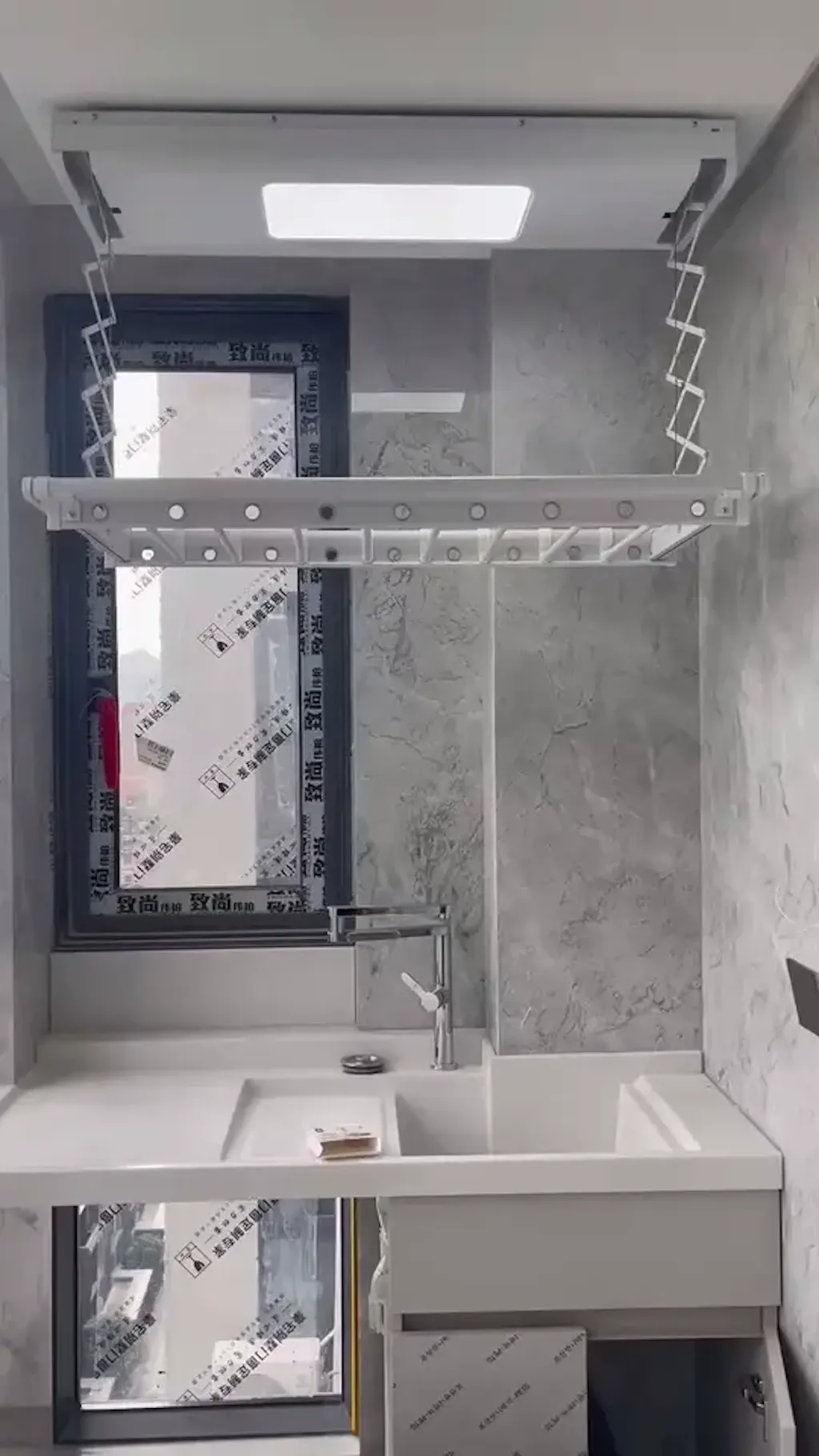 Un perfil delgado de 10 cm queda cerca del techo para un aspecto limpio y moderno, manteniendo el secado diario práctico.