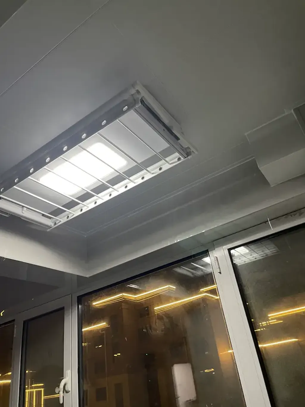 Tendedero EaseRack Pro con iluminación LED de pantalla completa, brillo de 6000K para uso nocturno, creando un ambiente hogareño acogedor.