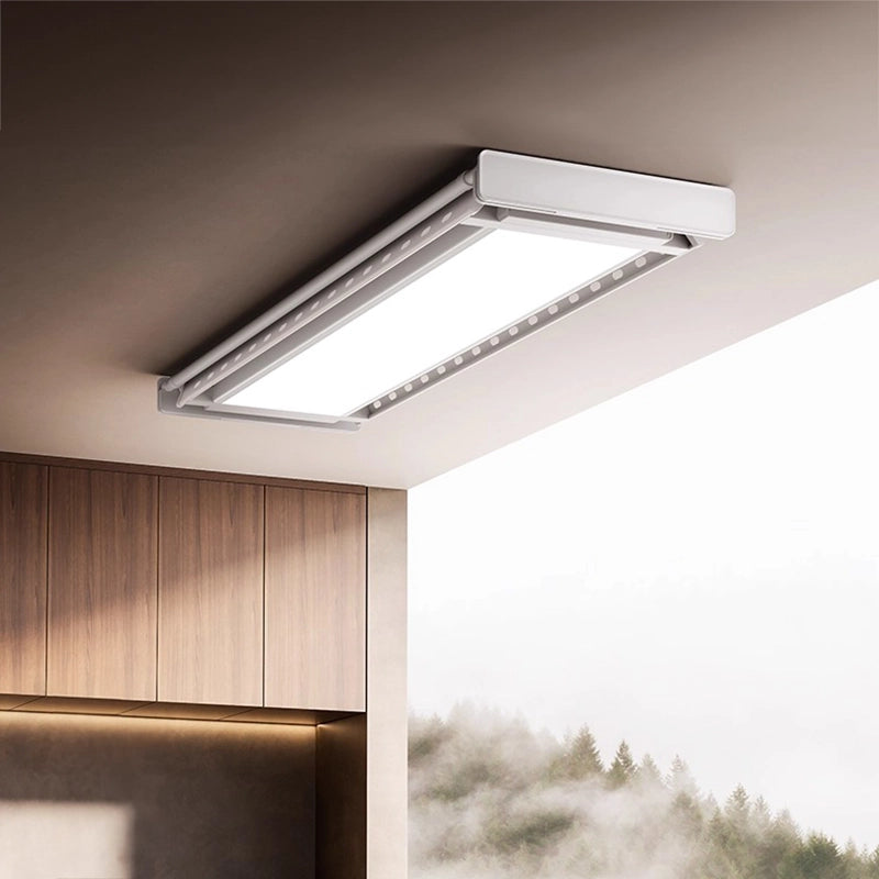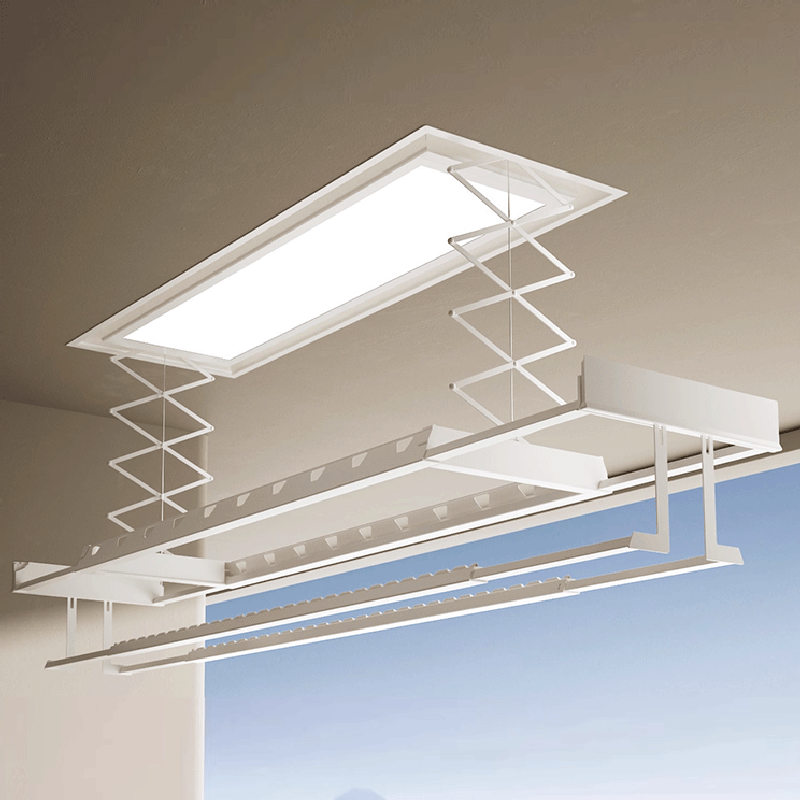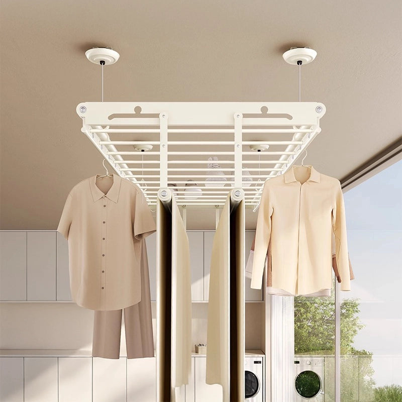 - Operated with a smart remote control, the rack lowers smoothly from the ceiling and can be stopped at any height for easy access.